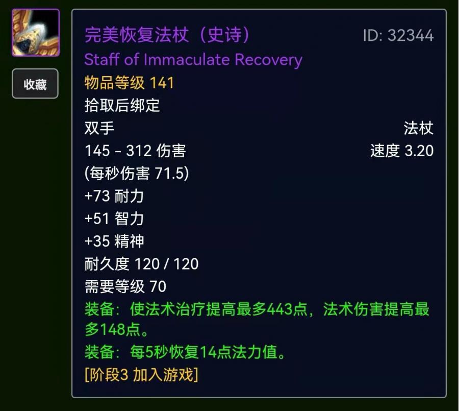 魔兽世界国际服燃烧的远征(疗毕业级法杖)属性:60 智力48 精神治疗效果 130还有法术暴击加成