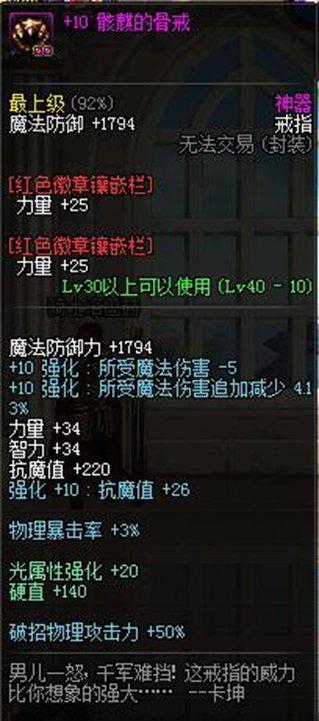地下城勇士(骸麒的骨戒)属性:物理攻击时伤害50提升远超普通史诗戒指
