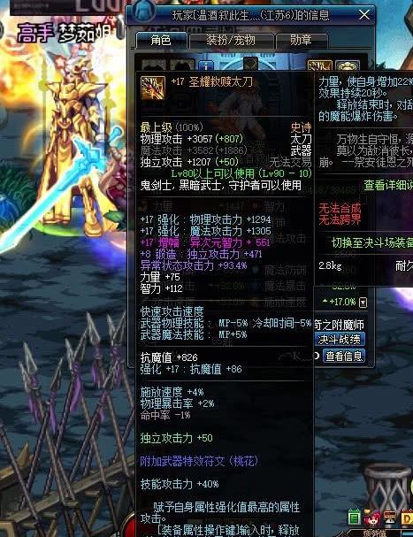 地下城勇士(圣耀救赎太刀)属性:开魔能后提升 35技能攻击力全程稳定高额增伤
